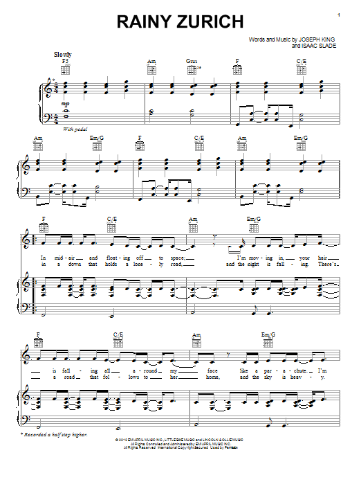 Download or print The Fray Rainy Zurich sheet music, chords and digital score arranged for Piano, Vocal & Guitar Chords (Right-Hand Melody). This Pop score includes 5 page(s).