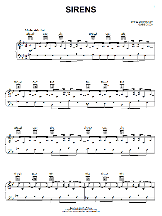 Download or print The Gabe Dixon Band Sirens sheet music, chords and digital score arranged for Piano, Vocal & Guitar Chords (Right-Hand Melody). This Alternative score includes 8 page(s).