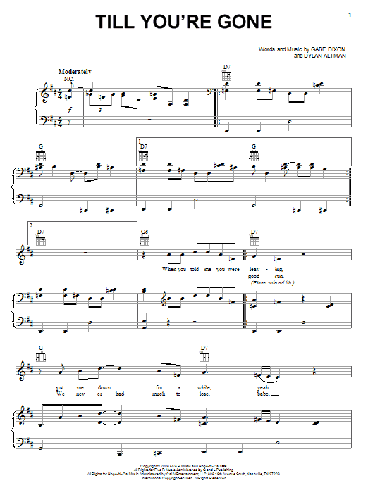 Download or print The Gabe Dixon Band Till You're Gone sheet music, chords and digital score arranged for Piano, Vocal & Guitar Chords (Right-Hand Melody). This Alternative score includes 5 page(s).