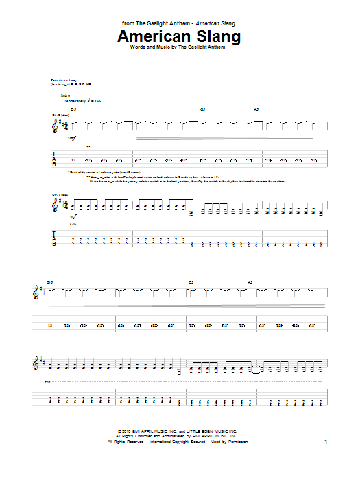Download or print The Gaslight Anthem American Slang sheet music, chords and digital score arranged for Guitar Tab. This Pop score includes 11 page(s).