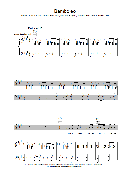 Download or print Gipsy Kings Bamboleo sheet music, chords and digital score arranged for Piano & Vocal. This Latin score includes 3 page(s).