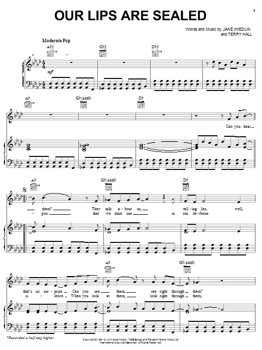 Download or print The Go-Go's Our Lips Are Sealed sheet music, chords and digital score arranged for Easy Piano. This Rock score includes 4 page(s).