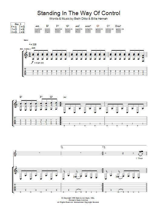 Download or print Gossip Standing In The Way Of Control sheet music, chords and digital score arranged for Guitar Tab. This Pop score includes 6 page(s).