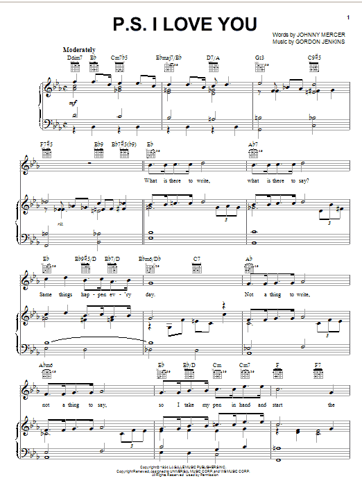Download or print The Hilltoppers P.S. I Love You sheet music, chords and digital score arranged for Real Book – Melody & Chords – Eb Instruments. This Jazz score includes 1 page(s).