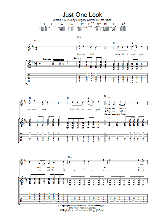Download or print The Hollies Just One Look sheet music, chords and digital score arranged for Guitar Tab. This Pop score includes 5 page(s).