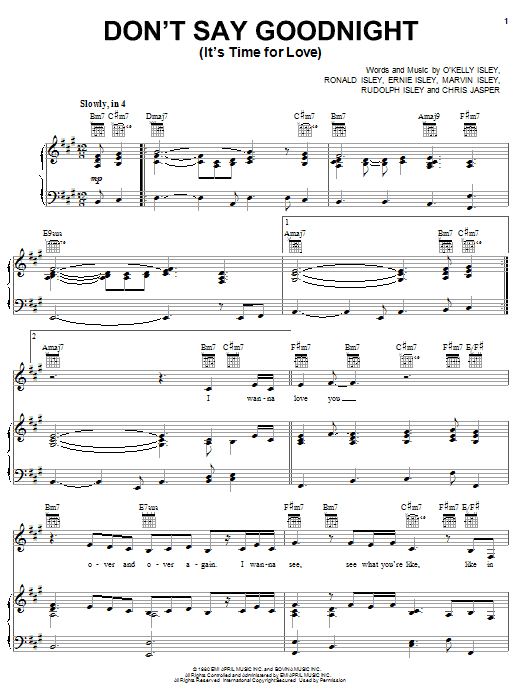 Download or print The Isley Brothers Don't Say Good Night (It's Time For Love) Parts 1 & 2 sheet music, chords and digital score arranged for Piano, Vocal & Guitar Chords (Right-Hand Melody). This Love score includes 6 page(s).