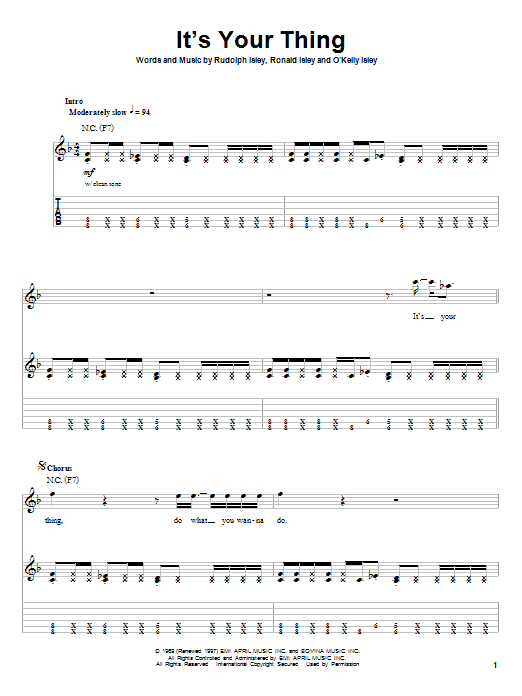 Download or print The Isley Brothers It's Your Thing sheet music, chords and digital score arranged for Piano, Vocal & Guitar Chords (Right-Hand Melody). This Pop score includes 4 page(s).