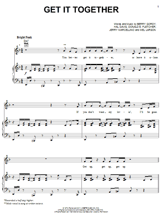 Download or print The Jackson 5 Get It Together sheet music, chords and digital score arranged for Piano, Vocal & Guitar Chords (Right-Hand Melody). This Pop score includes 7 page(s).