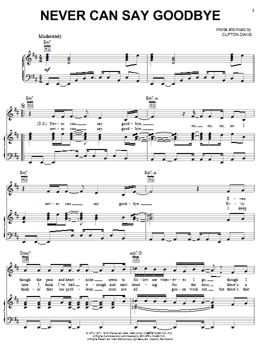 Download or print The Jackson 5 Never Can Say Goodbye sheet music, chords and digital score arranged for Piano, Vocal & Guitar Chords (Right-Hand Melody). This Disco score includes 3 page(s).