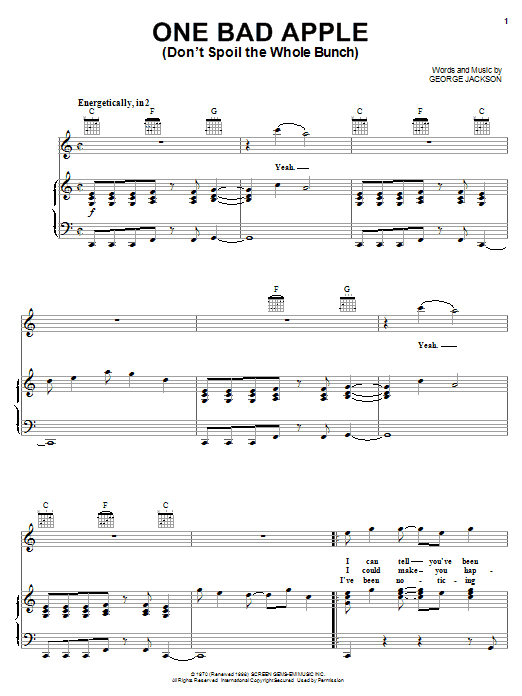 Download or print The Jackson 5 One Bad Apple (Don't Spoil The Whole Bunch) sheet music, chords and digital score arranged for Piano, Vocal & Guitar Chords (Right-Hand Melody). This Pop score includes 6 page(s).