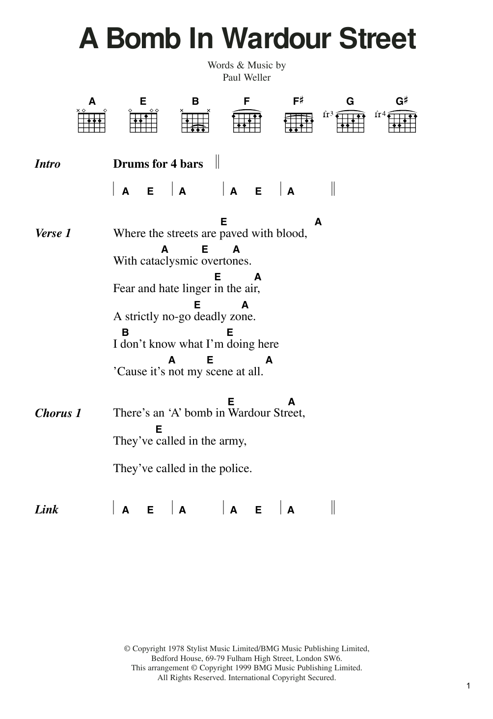 Download or print The Jam A Bomb In Wardour Street sheet music, chords and digital score arranged for Guitar Chords/Lyrics. This Rock score includes 3 page(s).