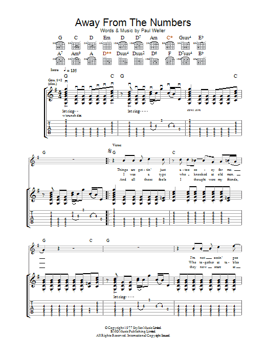 This composition is beautifuly arranged for Guitar Tab includes 8 page(s). It is performed by The Jam. The style of the score is 'Punk'. Catalog SKU number of the notation is 33269.