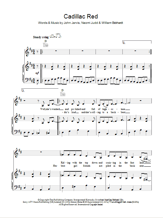 Download or print The Judds Cadillac Red sheet music, chords and digital score arranged for Piano, Vocal & Guitar Chords. This Country score includes 5 page(s).
