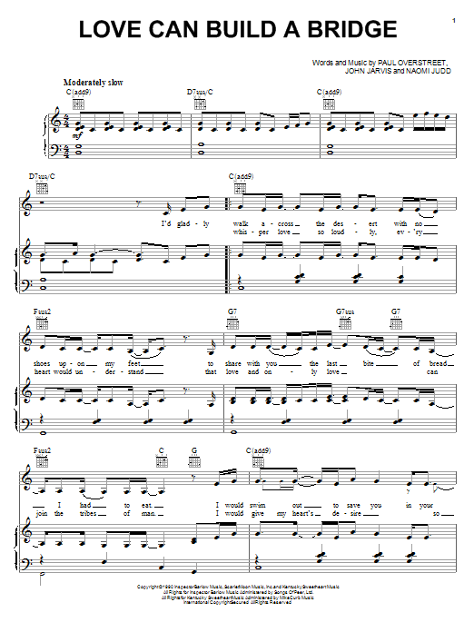 Download or print The Judds Love Can Build A Bridge sheet music, chords and digital score arranged for Guitar Chords/Lyrics. This Country score includes 2 page(s).
