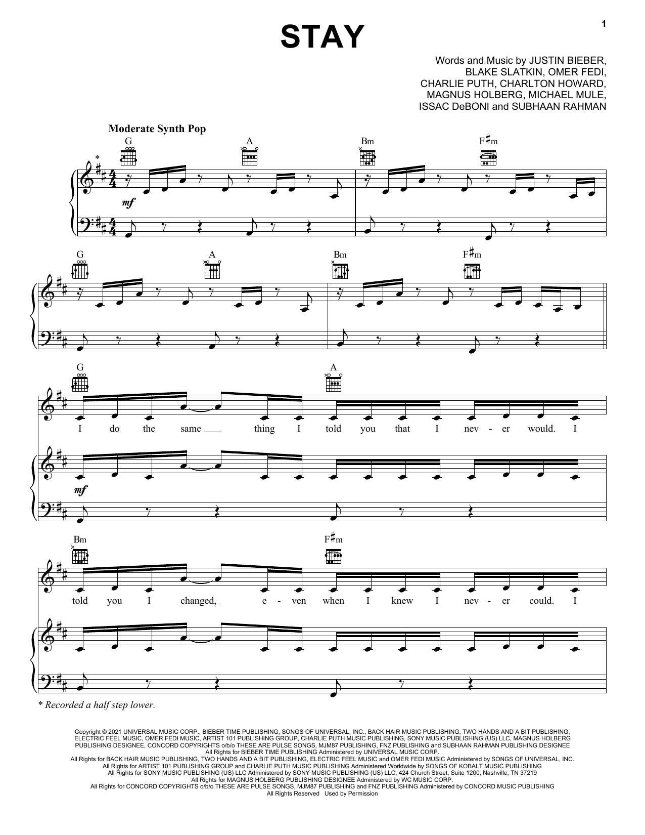 Download or print The Kid LAROI Stay (feat. Justin Bieber) sheet music, chords and digital score arranged for Easy Piano. This Pop score includes 5 page(s).