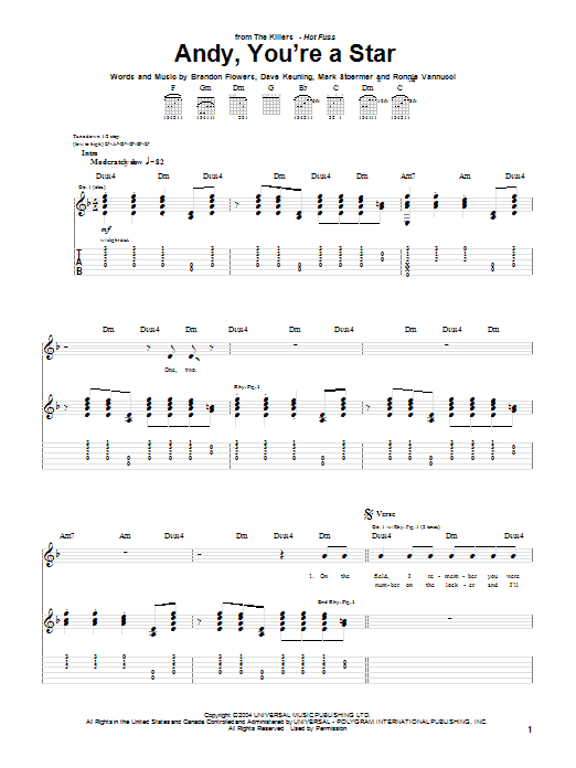 Download or print The Killers Andy, You're A Star sheet music, chords and digital score arranged for Guitar Tab. This Alternative score includes 5 page(s).