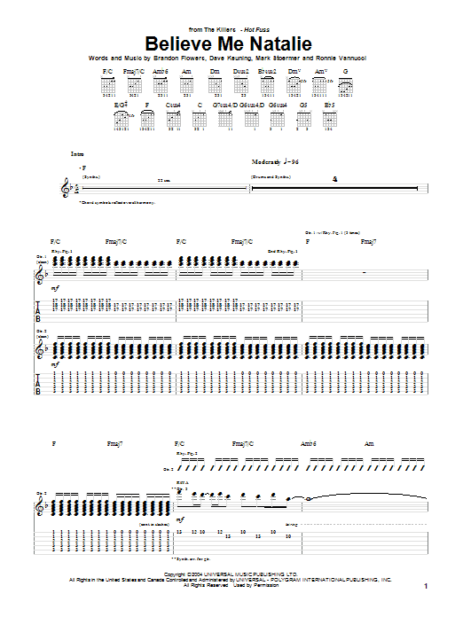 Download or print The Killers Believe Me Natalie sheet music, chords and digital score arranged for Guitar Chords/Lyrics. This Rock score includes 3 page(s).