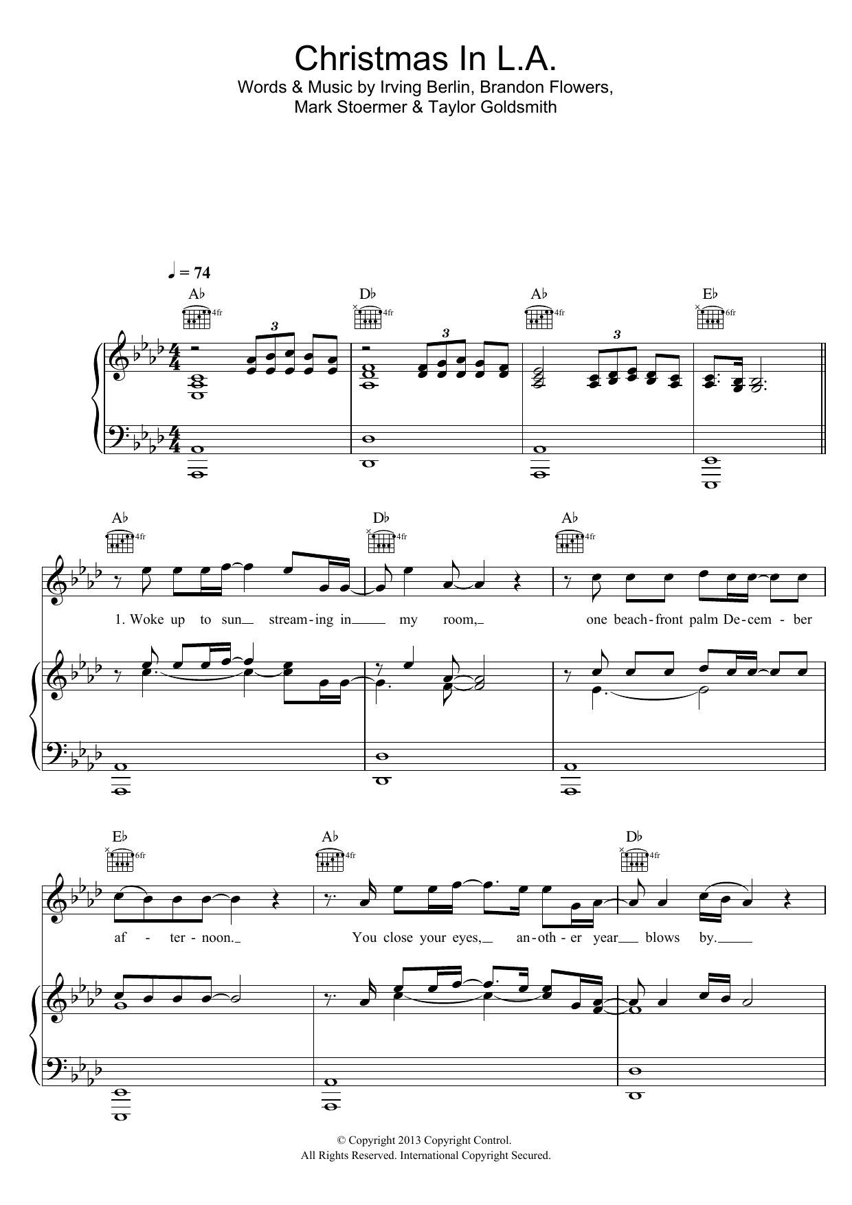 Download or print The Killers Christmas In L.A. (featuring Dawes) sheet music, chords and digital score arranged for Piano, Vocal & Guitar Chords (Right-Hand Melody). This Christmas score includes 7 page(s).