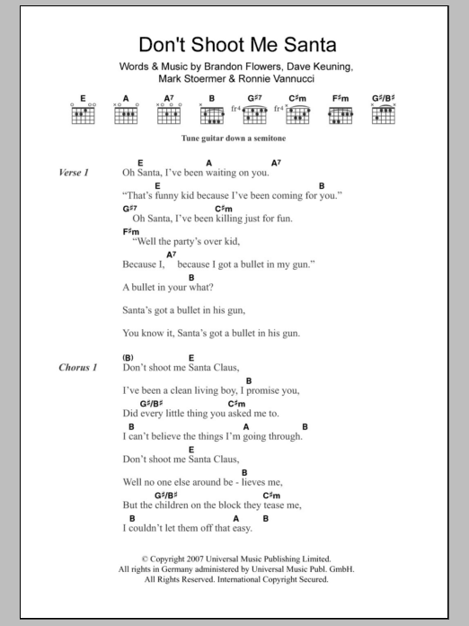 Download or print The Killers Don't Shoot Me Santa sheet music, chords and digital score arranged for Guitar Chords/Lyrics. This Pop score includes 3 page(s).