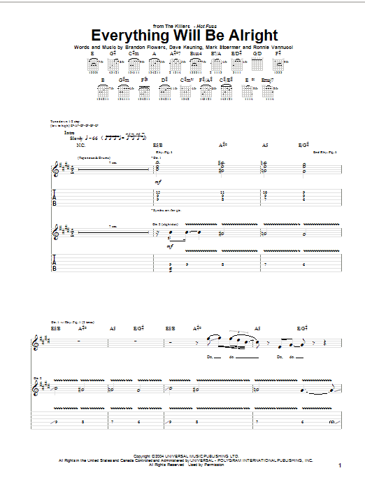 Download or print The Killers Everything Will Be Alright sheet music, chords and digital score arranged for Guitar Chords/Lyrics. This Rock score includes 2 page(s).