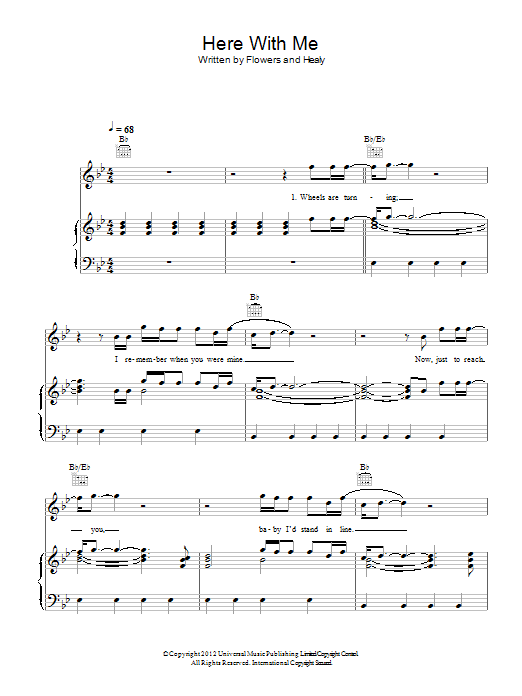 Download or print The Killers Here With Me sheet music, chords and digital score arranged for Piano, Vocal & Guitar Chords. This Pop score includes 7 page(s).