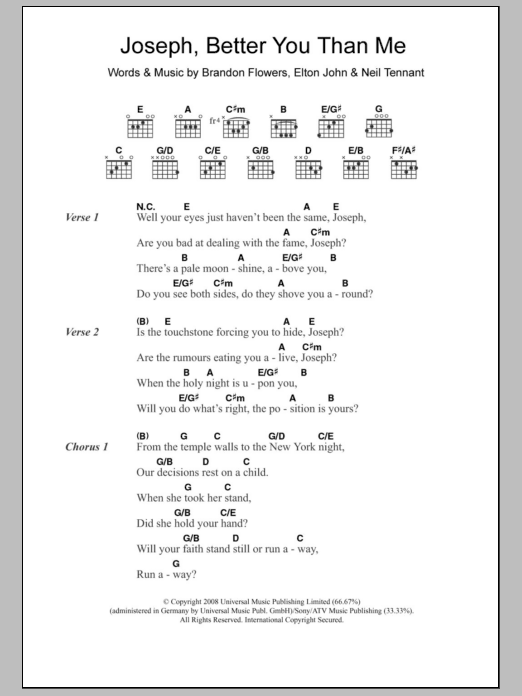 Download or print The Killers Joseph, Better You Than Me sheet music, chords and digital score arranged for Guitar Chords/Lyrics. This Rock score includes 3 page(s).