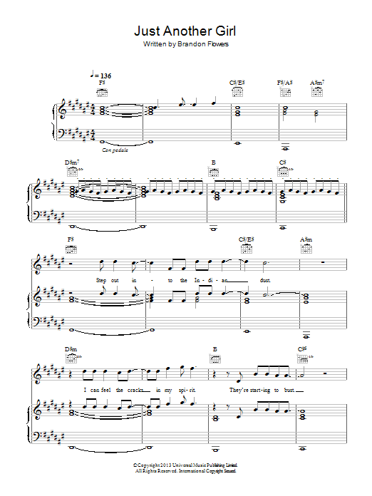 Download or print The Killers Just Another Girl sheet music, chords and digital score arranged for Piano, Vocal & Guitar Chords. This Pop score includes 8 page(s).
