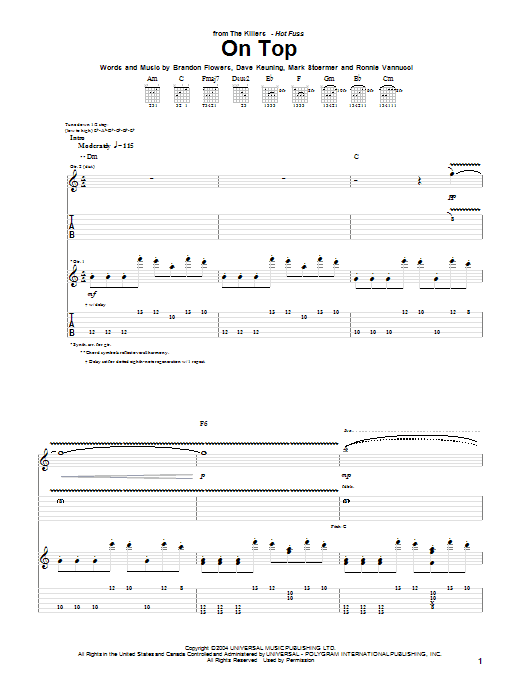 Download or print The Killers On Top sheet music, chords and digital score arranged for Guitar Tab. This Alternative score includes 9 page(s).