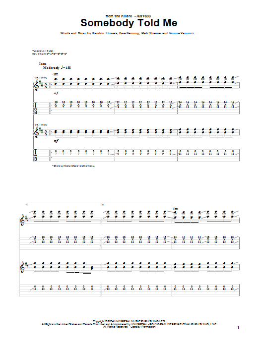 Download or print The Killers Somebody Told Me sheet music, chords and digital score arranged for Lead Sheet / Fake Book. This Rock score includes 2 page(s).