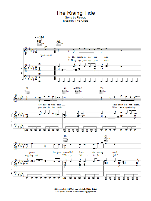 Download or print The Killers The Rising Tide sheet music, chords and digital score arranged for Piano, Vocal & Guitar Chords. This Pop score includes 7 page(s).