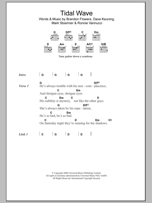 Download or print The Killers Tidal Wave sheet music, chords and digital score arranged for Guitar Chords/Lyrics. This Rock score includes 3 page(s).