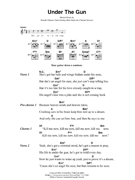 Download or print The Killers Under The Gun sheet music, chords and digital score arranged for Guitar Chords/Lyrics. This Rock score includes 2 page(s).