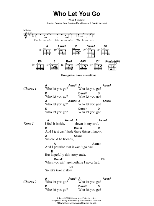 Download or print The Killers Who Let You Go sheet music, chords and digital score arranged for Guitar Chords/Lyrics. This Rock score includes 2 page(s).