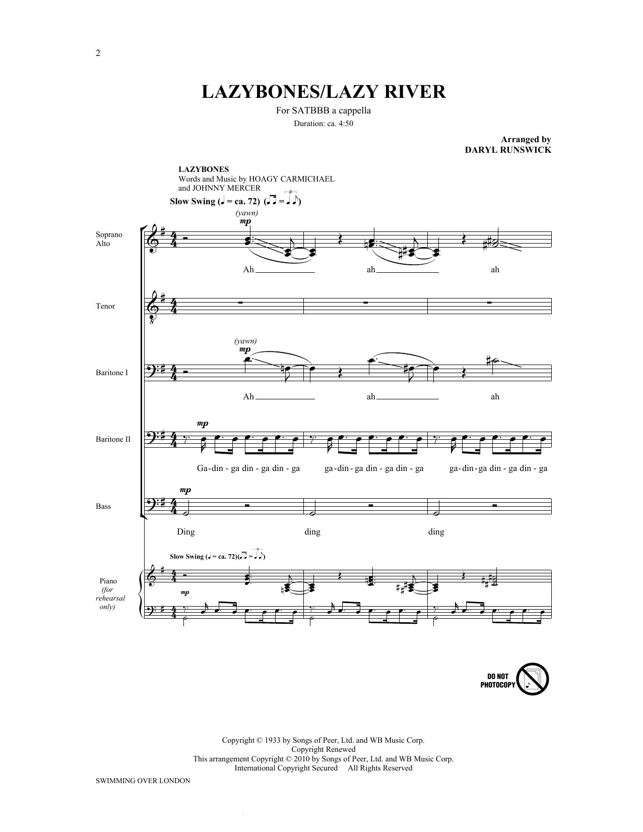 Download or print The King's Singers Lazybones/Lazy River (from Swimming Over London) sheet music, chords and digital score arranged for SATB Choir. This Pop score includes 15 page(s).