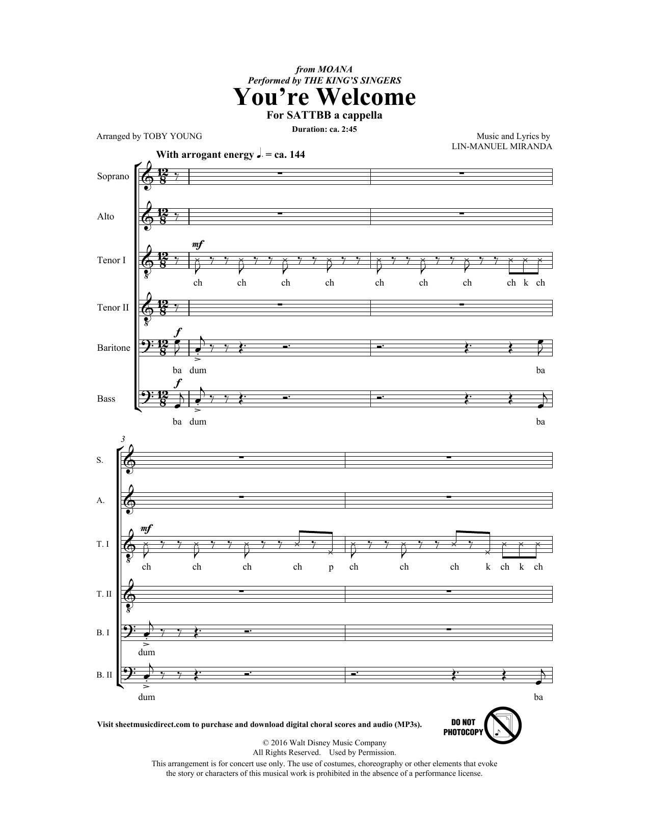 Download or print The King's Singers You're Welcome (from Moana) (arr. Toby Young) sheet music, chords and digital score arranged for Choir. This Disney score includes 22 page(s).