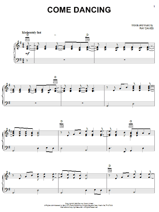 Download or print The Kinks Come Dancing sheet music, chords and digital score arranged for Guitar Chords/Lyrics. This Pop score includes 3 page(s).