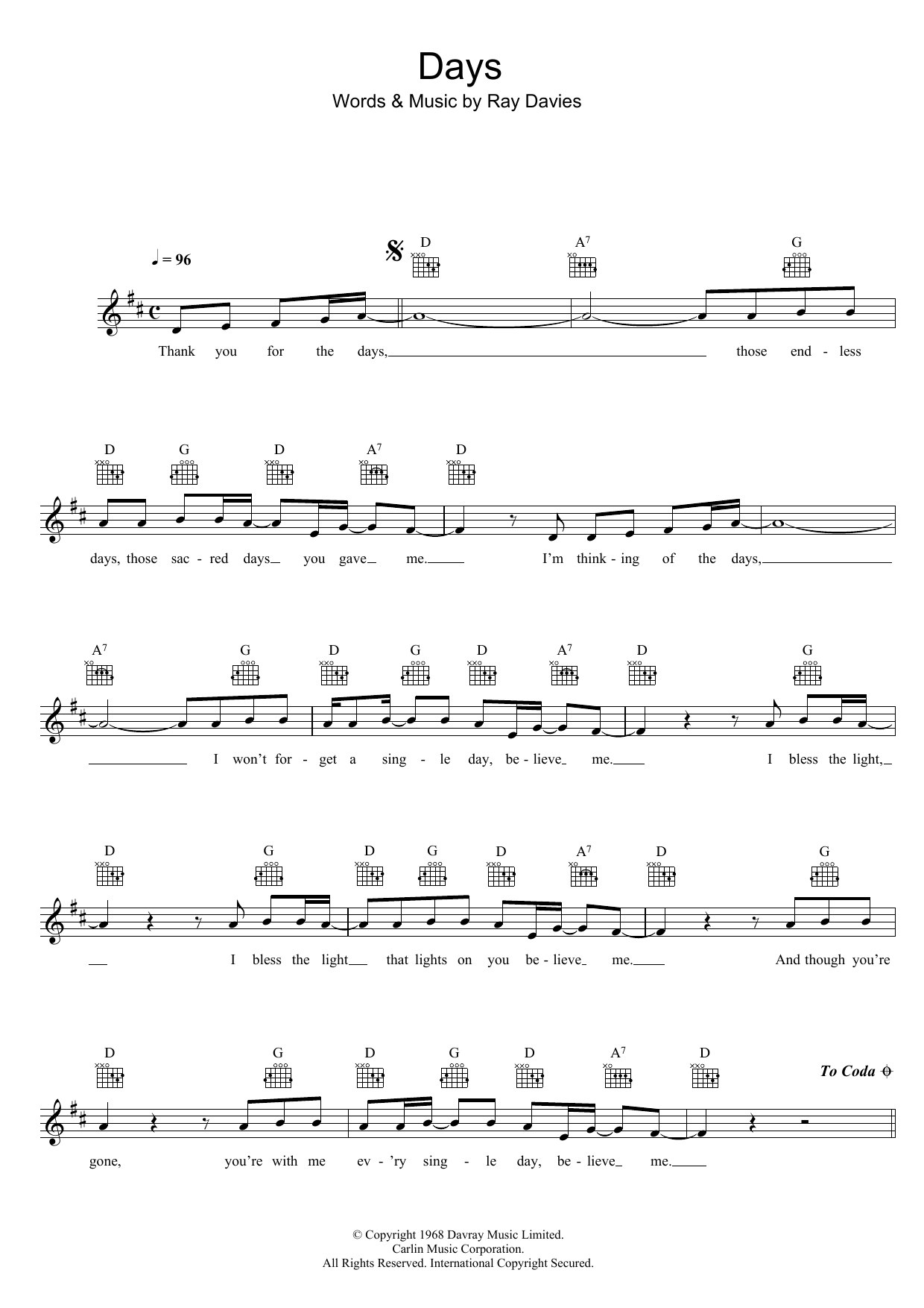 Download or print The Kinks Days sheet music, chords and digital score arranged for Guitar Chords/Lyrics. This Rock score includes 2 page(s).