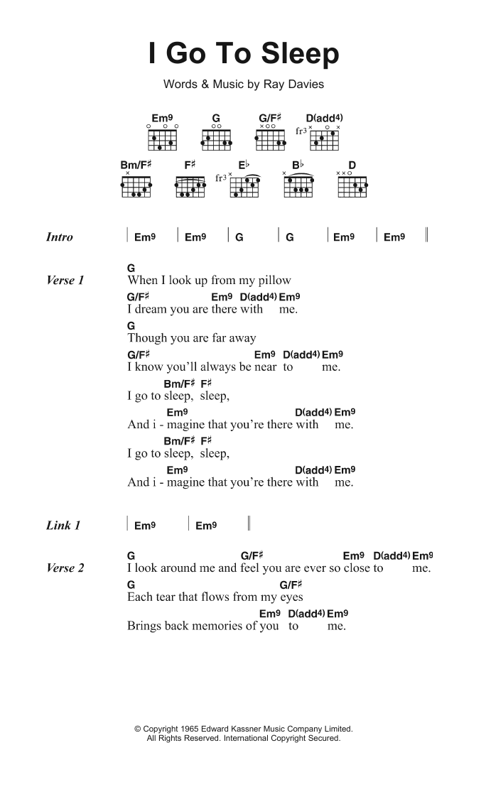 Download or print The Kinks I Go To Sleep sheet music, chords and digital score arranged for Guitar Chords/Lyrics. This Pop score includes 2 page(s).