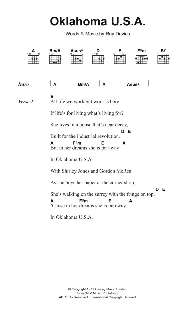Download or print The Kinks Oklahoma U.S.A sheet music, chords and digital score arranged for Guitar Chords/Lyrics. This Pop score includes 2 page(s).