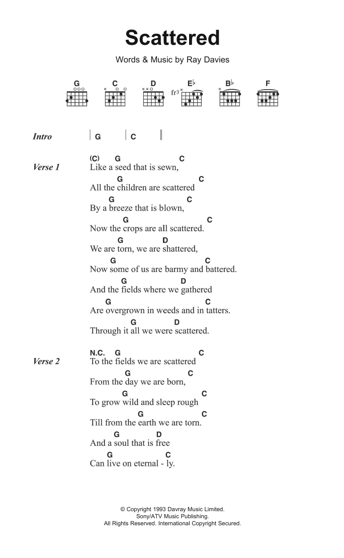Download or print The Kinks Scattered sheet music, chords and digital score arranged for Guitar Chords/Lyrics. This Pop score includes 4 page(s).