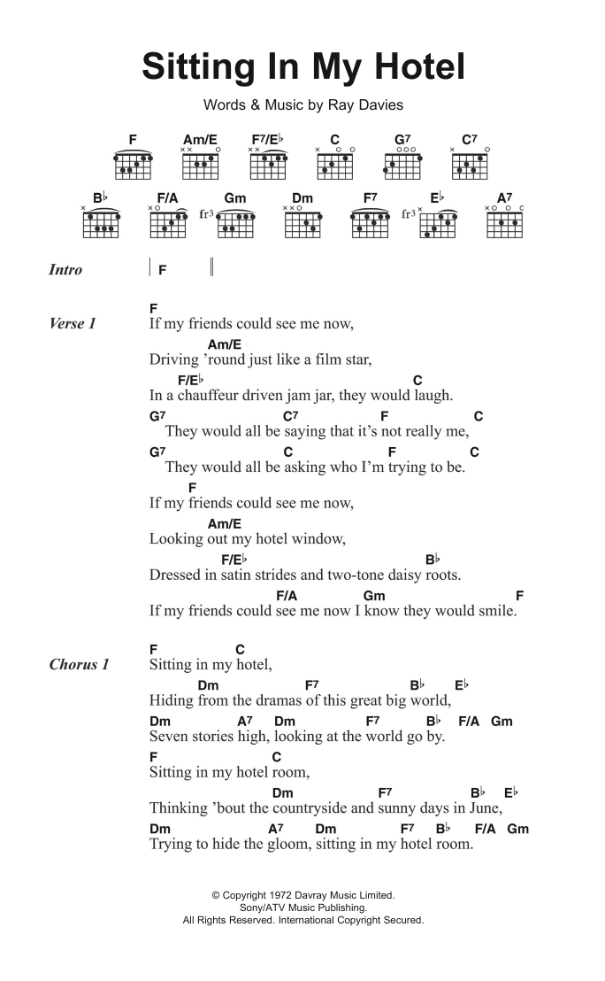 Download or print The Kinks Sitting In My Hotel sheet music, chords and digital score arranged for Guitar Chords/Lyrics. This Pop score includes 2 page(s).