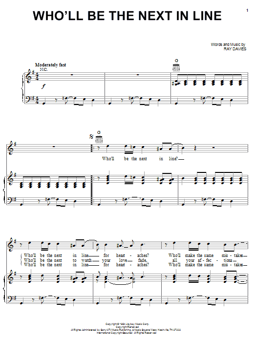 Download or print The Kinks Who'll Be The Next In Line sheet music, chords and digital score arranged for Piano, Vocal & Guitar Chords (Right-Hand Melody). This Pop score includes 4 page(s).