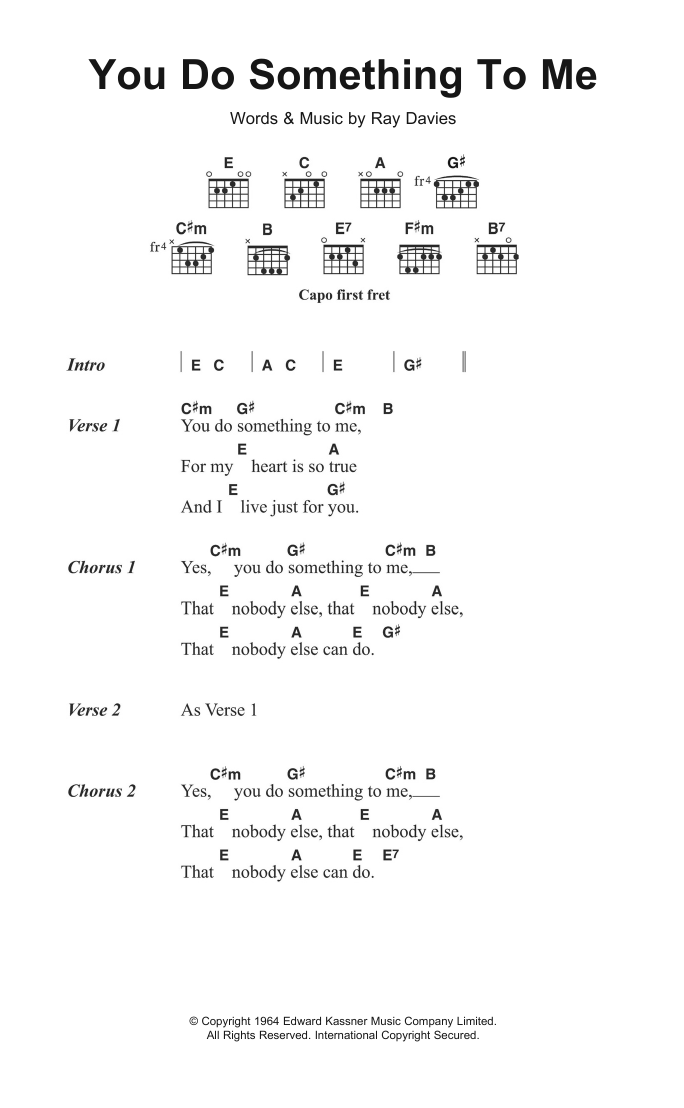 Download or print The Kinks You Do Something To Me sheet music, chords and digital score arranged for Guitar Chords/Lyrics. This Pop score includes 2 page(s).