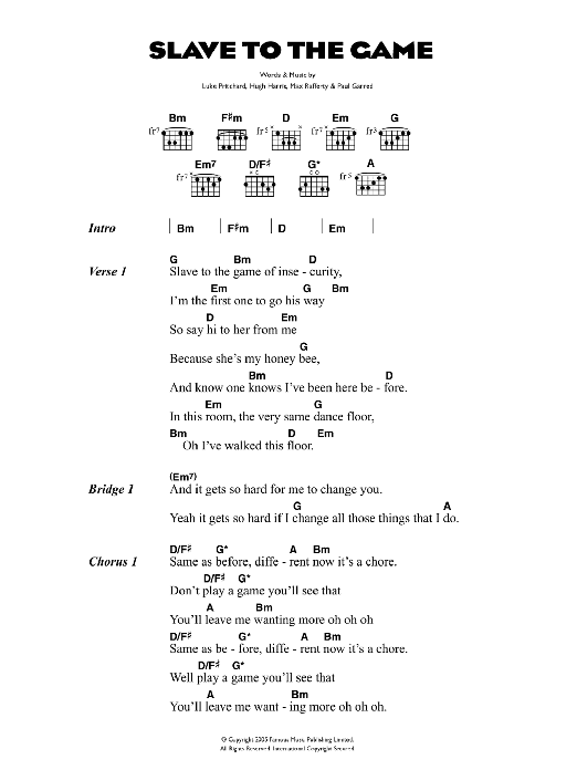 Download or print The Kooks Slave To The Game sheet music, chords and digital score arranged for Guitar Chords/Lyrics. This Rock score includes 2 page(s).