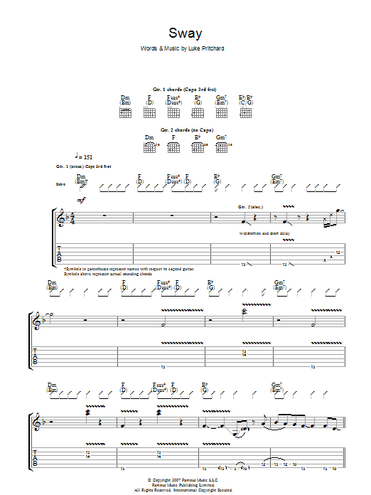 Download or print The Kooks Sway sheet music, chords and digital score arranged for Guitar Tab. This Rock score includes 8 page(s).