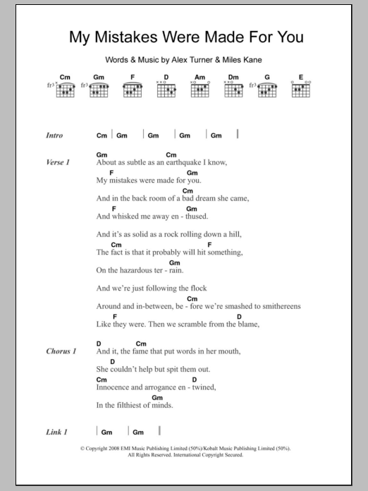 Download or print The Last Shadow Puppets My Mistakes Were Made For You sheet music, chords and digital score arranged for Guitar Chords/Lyrics. This Pop score includes 2 page(s).
