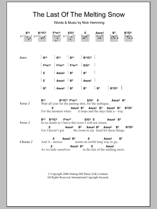 Download or print The Leisure Society The Last Of The Melting Snow sheet music, chords and digital score arranged for Guitar Chords/Lyrics. This Pop score includes 2 page(s).
