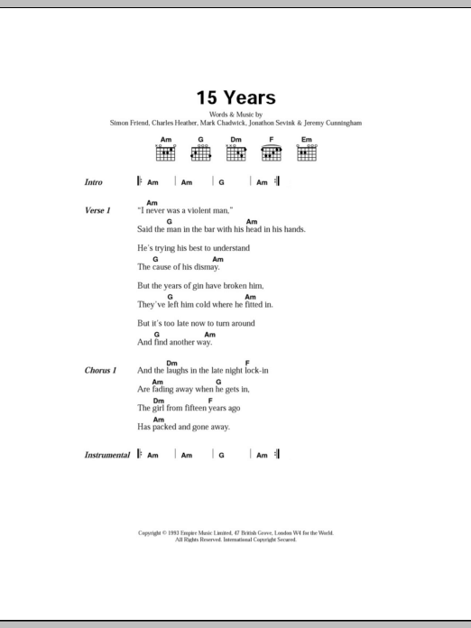 Download or print The Levellers 15 Years sheet music, chords and digital score arranged for Guitar Chords/Lyrics. This Rock score includes 2 page(s).