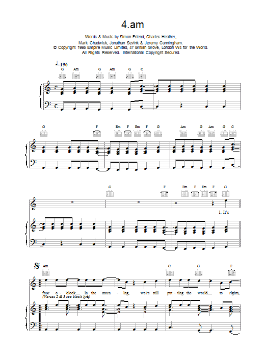 Download or print The Levellers 4am sheet music, chords and digital score arranged for Piano, Vocal & Guitar Chords. This Alternative score includes 6 page(s).