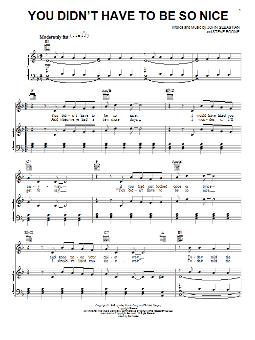 Download or print The Lovin' Spoonful You Didn't Have To Be So Nice sheet music, chords and digital score arranged for Piano, Vocal & Guitar Chords (Right-Hand Melody). This Film/TV score includes 3 page(s).